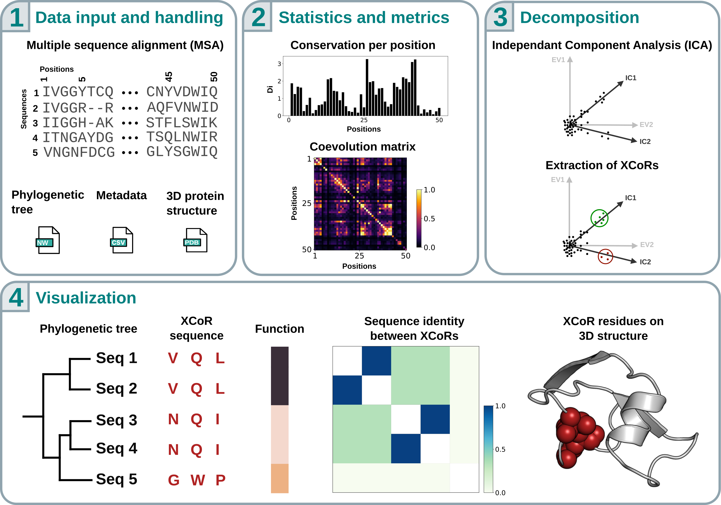 The library includes several coevolution metrics (and allows users to define their own), along with various correction methods, enabling easy comparison between approaches. It also integrates with the molecular visualization software PyMOL, allowing users to map results onto 3D structures, more specifically, extremal co-evolving residues that form the basis of protein sectors [eal25].